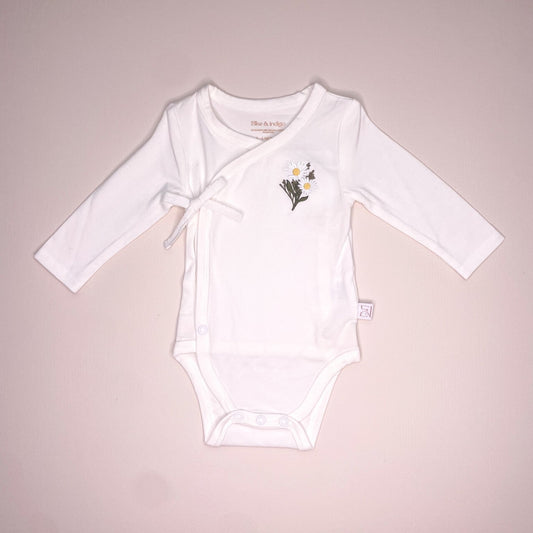 This is the perfect little body suit for cooler autumn mornings and will be great for layering under a jacket when winter comes. The colour is super flattering and the embroidered flowers look very pretty. It washes well but i recommend definitely a cold wash gentle cycle in a garmet bag if possible.
